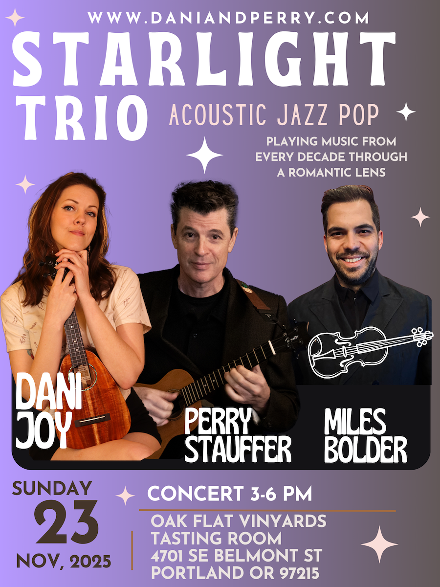 Oakflat Wine Tasting with Miles Sunday Nov 23 - 3-6pm PT 4701 SE Belmont, Portland Or 97215 The Starlight Trio is comprised of 3 acoustic musicians who know how to cast a spell. Playing songs from 1920-1980, they will transport you to a small Paris cafe one moment, then into a New York speak easy the next. They’ll even mix a little cafe with David Bowie and the Talking Heads. Dani is known for her velvety vocals, Perry for his thrilling jazz stylings on ukulele and Miles turns up the class with his tasteful, enticing violin playing. Oakflat Wine Tasting Room is so Portland. You’ll cozy up at a little bistro table or couch surrounded by winemaking equipment in a chic warehouse-type setting. The elevated stage gives you a perfect view of the musicians who can be seen from the outside tables as well. Enjoy a wine tasting and scrumptious bites. You'll probably join the wine club!