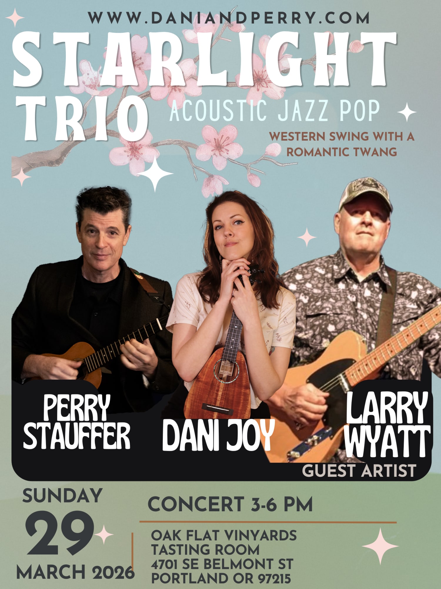 Oakflat Wine Tasting Description w/ Larry Wyatt The Starlight Trio brings Western Swing and vintage jazz from the 1920s–1960s with a romantic twang. Dani’s velvety vocals and bass grooves, Perry’s thrilling jazz ukulele and bass lines, and Larry Wyatt’s witty guitar originals transport you from a Paris café to a barnyard dance. Oakflat Wine Tasting Room is so Portland.